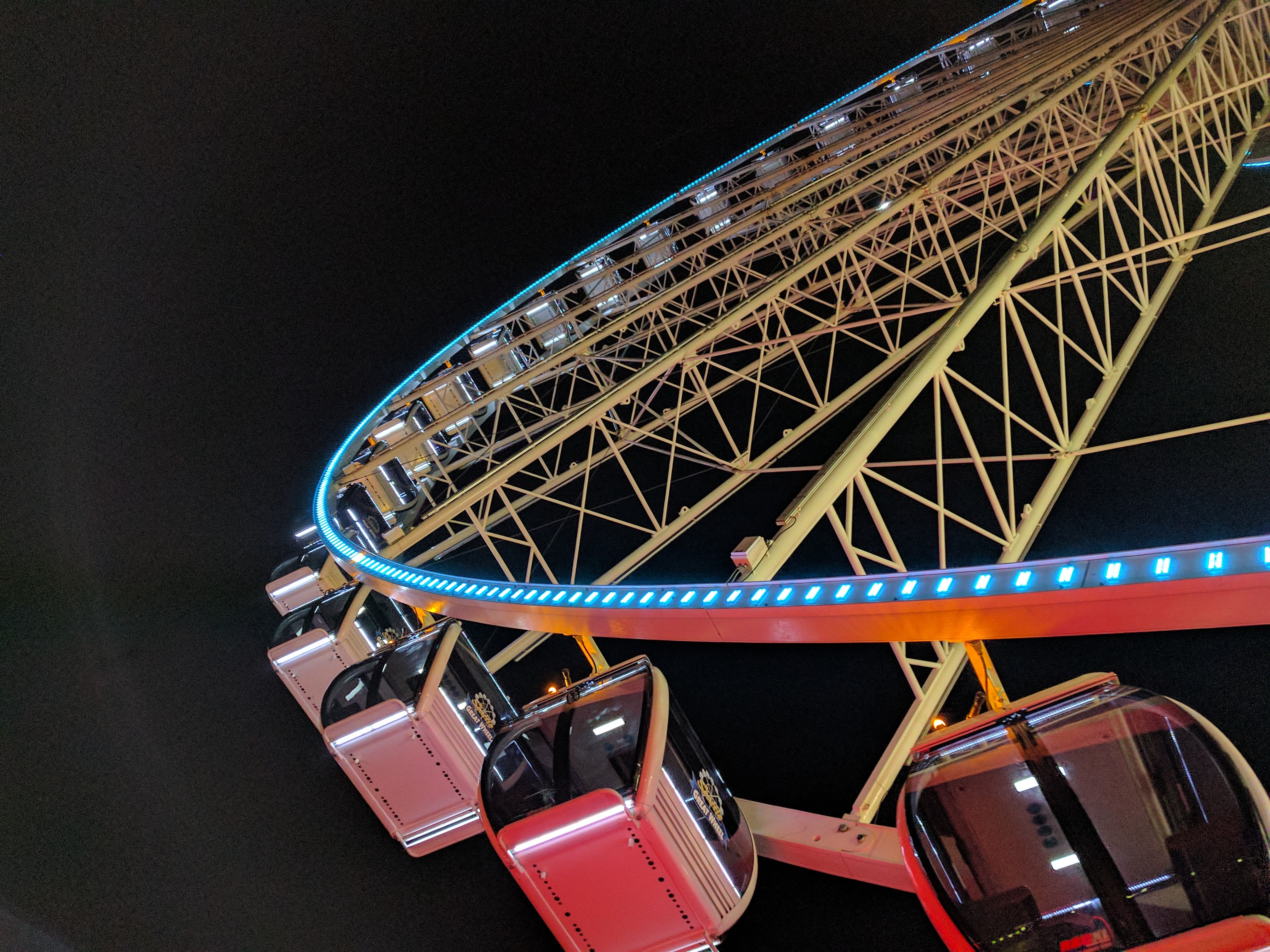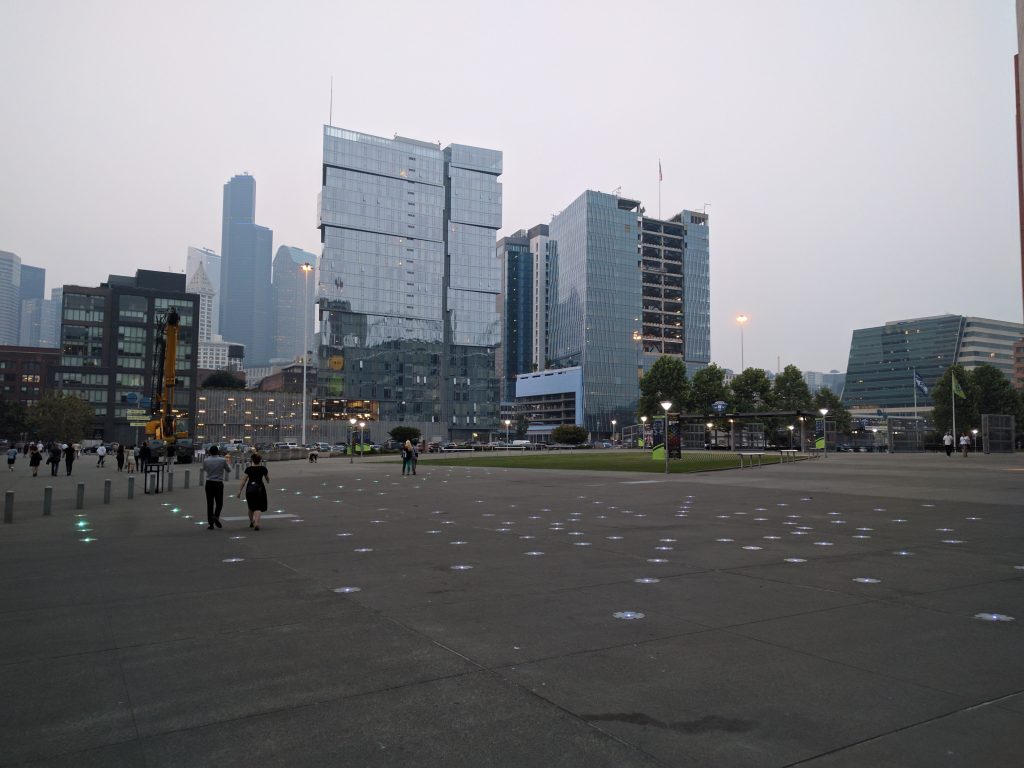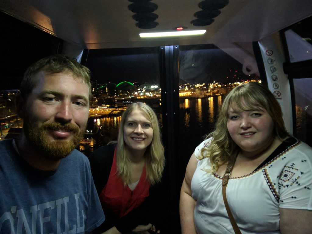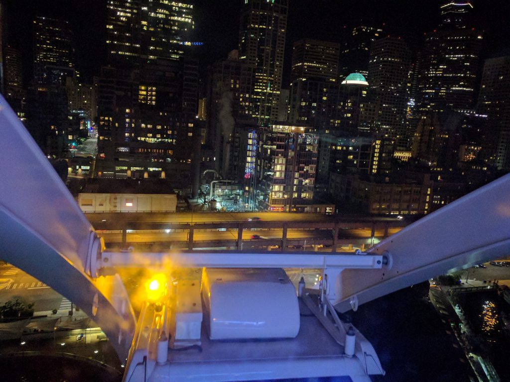 I was pretty fried from all that, so I took a rest, then arrived late at a YSA block party at someone’s large house a half-hour drive away. I arrived just in time to hear about a friend in the ward who’d just been whisked away to the ER in Seattle for a busted knee, an injury sustained in the pool after someone landed on her or something. She needed a second person to give a blessing, so I went off with a couple friends and visited with her for a while. We then went off to do the Seattle ferris wheel, since it wasn’t quite midnight yet.