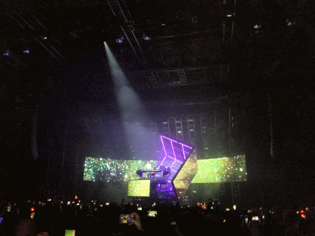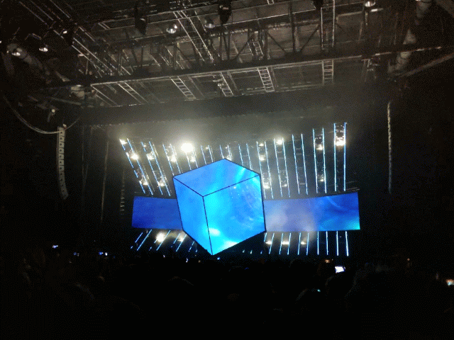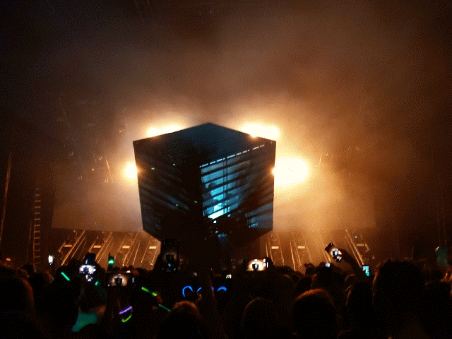 The concert tour he’s on features a neat prop, a giant cube that he performs within, which rotates around him. The atmosphere was great, the music was LOUD, the effects were amazing, and the music videos were cursed.