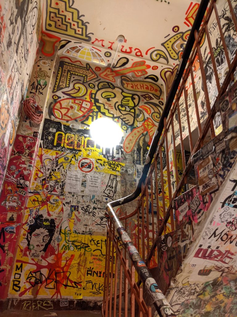 One of my favorite places in Berlin was this area with a collection of little courtyards, each with their own personality. One of the more striking ones was a place absolutely covered in street art and band stickers.
