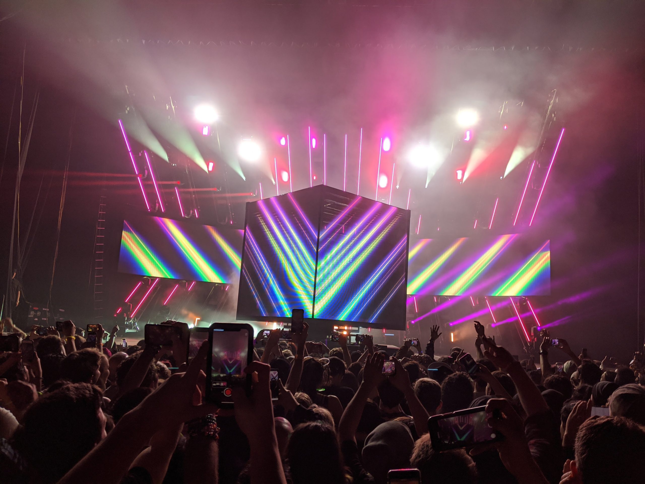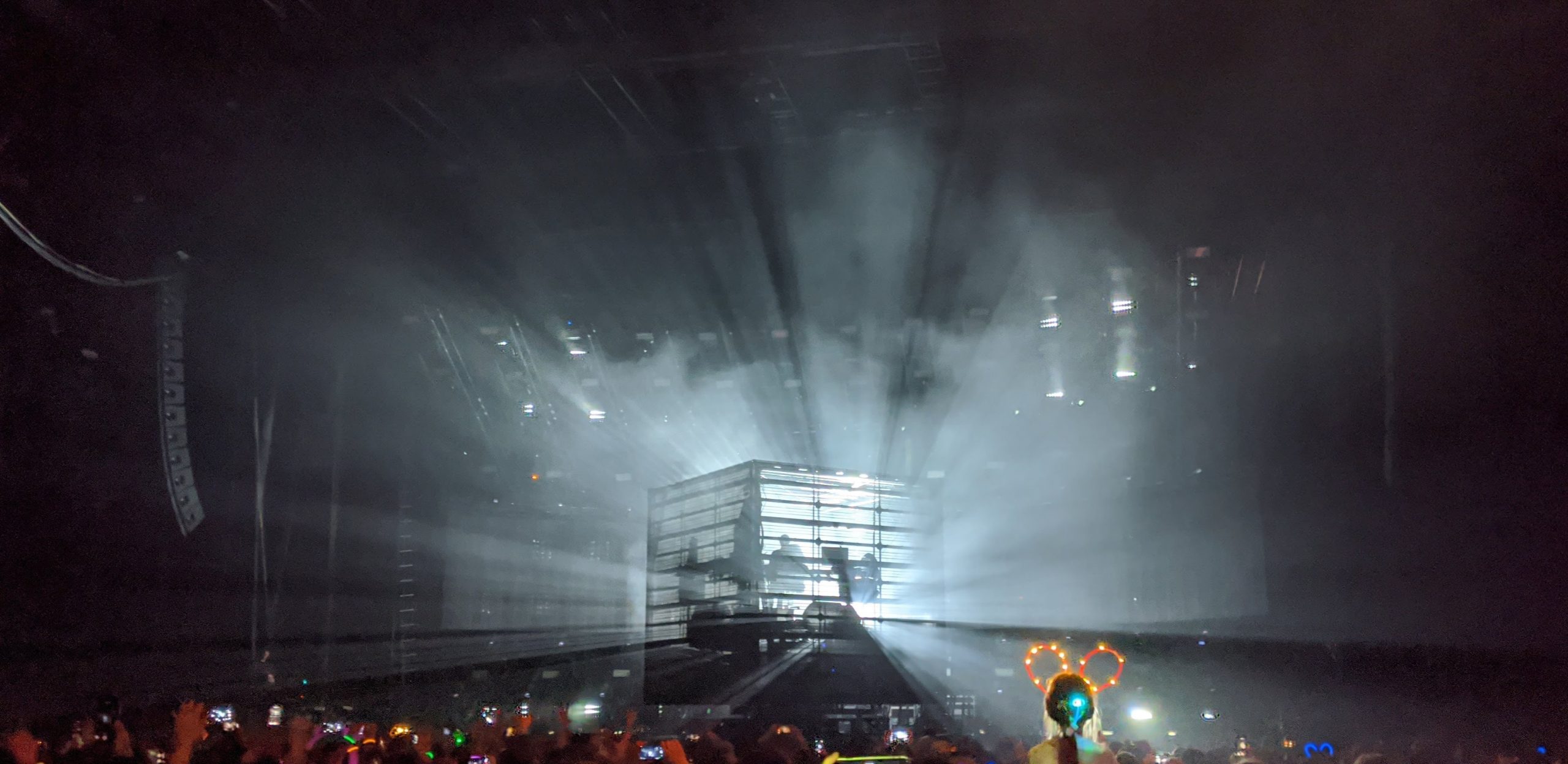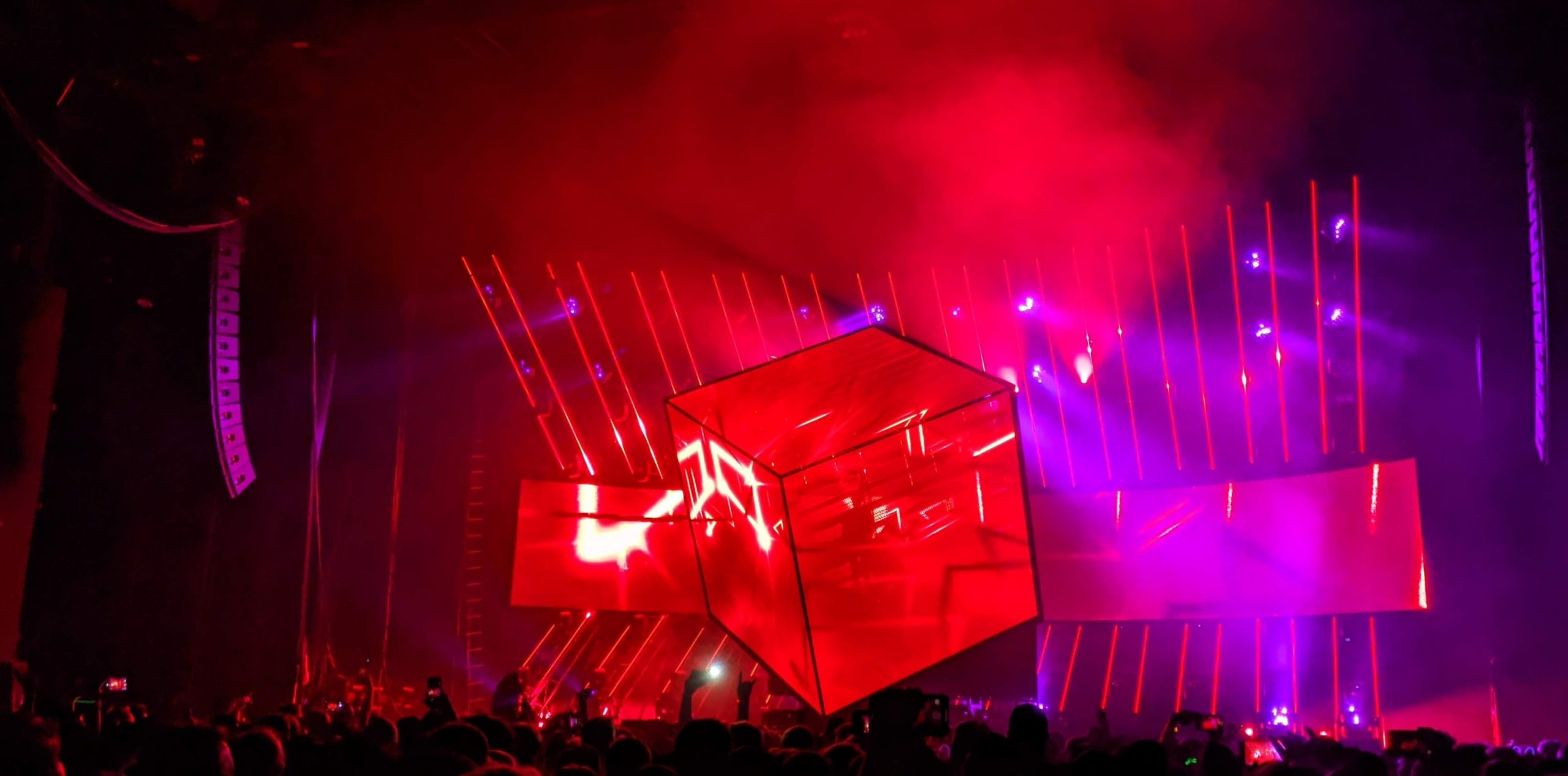 The concert tour he’s on features a neat prop, a giant cube that he performs within, which rotates around him. The atmosphere was great, the music was LOUD, the effects were amazing, and the music videos were cursed.