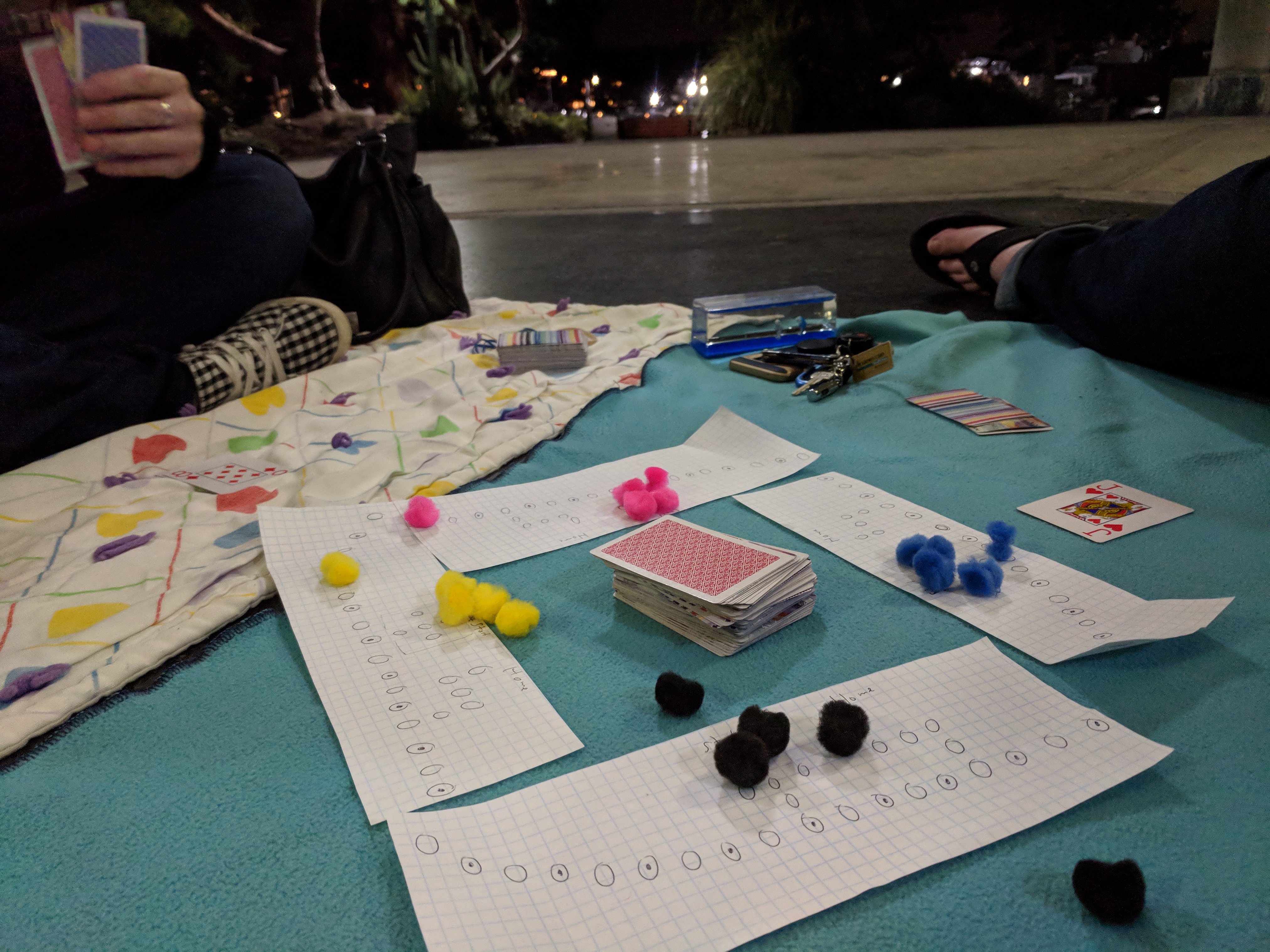 Then we busted out some paper and fuzz balls to play Poor Man’s Joker’s Wild under the gazebo.